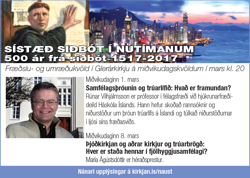Fyrsta fræðslukvöldið í vor 2017 var 1. mars kl. 20 undir yfirskriftinni Sístæð siðbót í nútímanum. Efni kvöldsins var Samfélagsþróunin og trúarlífið: Hvað er framundan? Í erindinu fór Rúnar Vilhjálmsson yfir stöðu og þróun trúarlífs í samfélaginu í ljósi hugmynda um nútímavæðingu og veraldarhyggju. Þá fjallaði hann um rannsóknir og niðurstöður um þróun trúarlífs á Íslandi og niðurstöður túlkaðar í ljósi fræðilegrar umræðu. Loks ræddi hann um framtíðarhorfur trúarlífs og trúarstofnana á Íslandi.