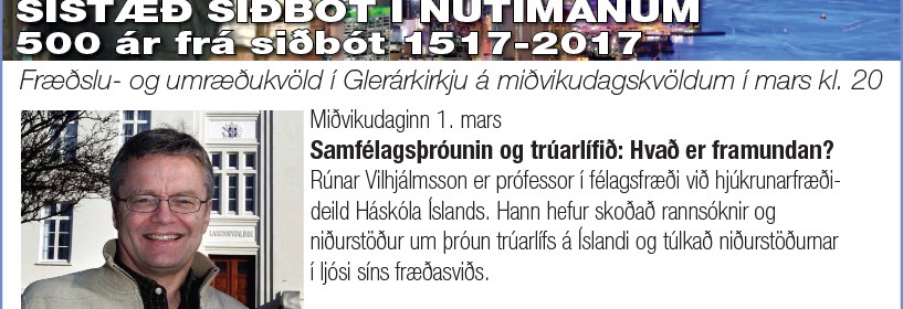 Fyrsta fræðslukvöldið í vor 2017 var 1. mars kl. 20 undir yfirskriftinni Sístæð siðbót í nútímanum. Efni kvöldsins var Samfélagsþróunin og trúarlífið: Hvað er framundan? Í erindinu fór Rúnar Vilhjálmsson yfir stöðu og þróun trúarlífs í samfélaginu í ljósi hugmynda um nútímavæðingu og veraldarhyggju. Þá fjallaði hann um rannsóknir og niðurstöður um þróun trúarlífs á Íslandi og niðurstöður túlkaðar í ljósi fræðilegrar umræðu. Loks ræddi hann um framtíðarhorfur trúarlífs og trúarstofnana á Íslandi.
