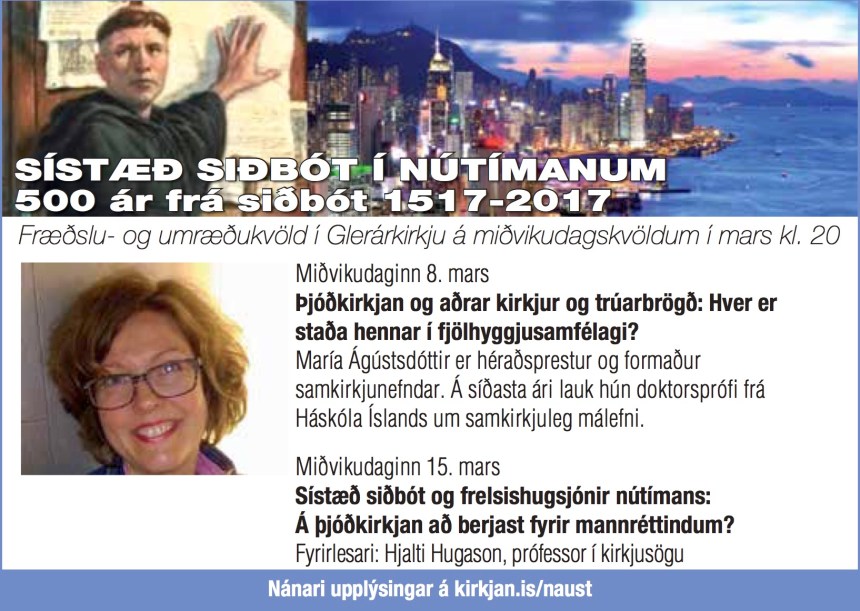 Á fræðslu- og umræðukvöld í Glerárkirkju 8. mars kl. 20 fjallaði dr. Maríu Ágústsdóttur um samkirkjuleg málefni: Þjóðkirkjan og aðrar kirkjudeildir og trúarbrögð: Hver er staða hennar í fjölhyggjusamfélagi? (Nánari upplýsingar hér á vefnum). Hún er formaður samstarfsnefndar kristinna trúfélag og lauk nýverið við doktorsritgerð um samkirkjuleg mál á Íslandi.