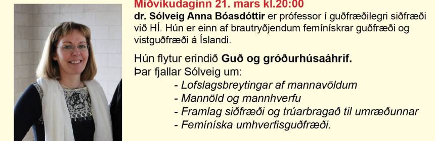 Dr. Sólvegi Anna Bóasdóttir flytur erindið um siðfræði, trúarbrögð og loftslagsbreytingar. Hún er prófessor í guðfræðilegri siðfræði við Háskóla Íslands. Hún er einn af brautryðjedum femínískrar guðfræði og vistguðfræði á Íslandi.