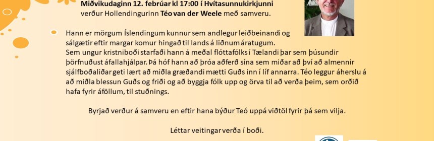 Miðvikudaginn 12. febrúar kl. 17 í Hvítasunnukirkjunni verður Hollendingurinn Téo van der Weele með samveru.