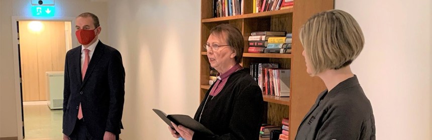 Starfskonur Skjólsins, þær Rósa Björg Brynjarsdóttir, sem veitir því forstöðu, og Una Sigrún Ástvaldsdóttir sem er í 50% starfshlutfalli við setrið, og Fjóla Halldórsdóttir sem er í 60% starfshlutfalli, sýndu gestum aðstöðuna og ræddu við þá. Magnea Sverrisdóttir, djákni á Biskupsstofu, hefur og starfsskyldur við Skjólið. Að sjálfsögðu var allra sóttvarnareglna gætt og grímunotkun viðhöfð eins og sjá má af myndum. Setrið er opið fimm daga vikunnar frá kl. 11.00 til 15.00. Það var þann 15. febrúar s.l. sem Skjólið var opnað. Stefnt er að því að fara hægt af stað og þróa starfsemina eftir því sem reynslan segir til um. Strax hafa nokkrar konur komið og sumar hafa komið oftar en einu sinni. Víst er að þessi þjónusta þjóðkirkjunnar við konur sem eru í bágri stöðu mun spyrjast út og verða vel sótt eins og búist er við. Við athöfnina í gær voru nokkrar konur sem sótt hafa Skjólið viðstaddar. Þeim leist mjög vel á hvernig búið hefur verið að starfsemi Skjólsins og voru mjög þakklátar.