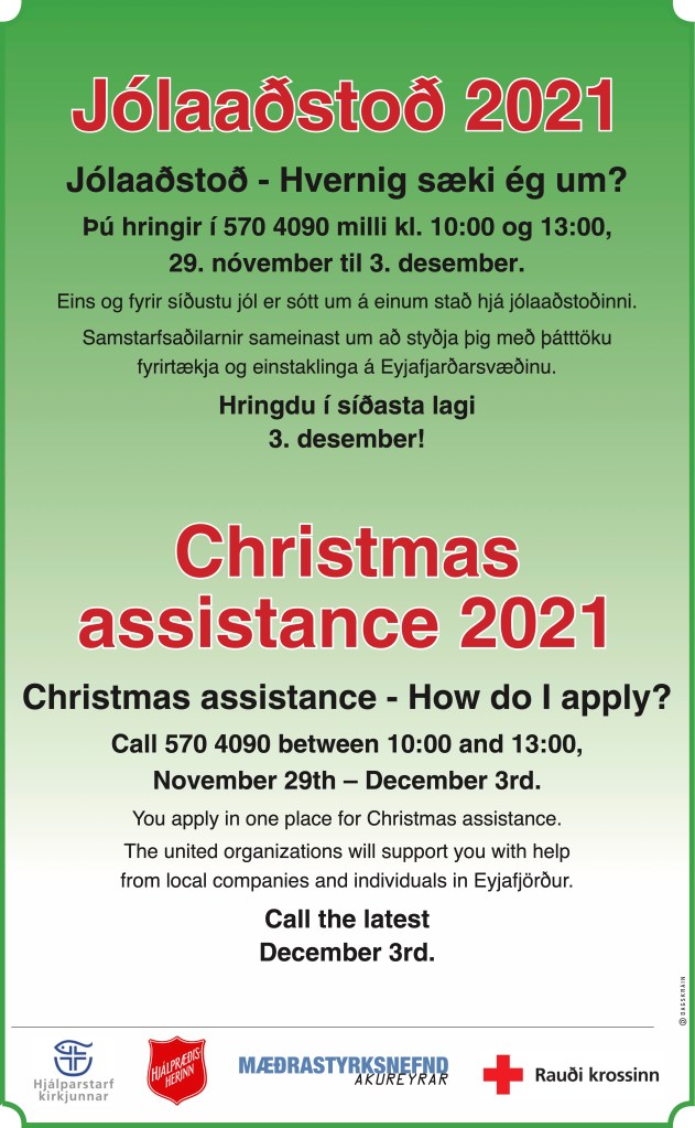 Eins og undanfarin ár verður samstarf um jólaaðstoð milli Hjálparstarfs kirkjunnar, Hjálpræðishersins, Mæðrastyrksnefndar Akureyrar og Rauða krossins við Eyjafjörð. Þannig er sótt um að hringt er í síma 570 4090 milli kl. 10:00 og 13:00 alla virka daga frá 29. nóvember til 3. desember. Vegna Covid verður tekið viðtal símleiðis um leið og bókaður er tími til að skrifa undir umsóknina og koma með upplýsingar á staðgreiðsluyfirliti sem má nálgast hjá skattinum eða sækja með rafrænum skilríkjum. Aðstoðin er bónuskort og utan Akureyrar Nettókort sem nota má í verslunum til matarkaupa fyrir þá sem eiga lítið handa á milli.