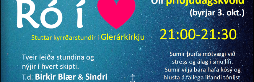 Ertu 16 – 20 ára? Þarftu smá pásu? Ró í hjarta eru stuttar kyrrðarstundir í Glerárkirkju öll þriðjudagskvöld (byrjar 3. okt.) 21:00 – 21:30. Tveir leiða stundina og nýjir í hvert skipti. T.d. Birkir Blær & Sindri, Hjalti & Lára. Kostar ekkert. Sumir þurfa mótvægi við stress og álag í sínu lífi. Sumir vilja bara hafa kósý og hlusta á