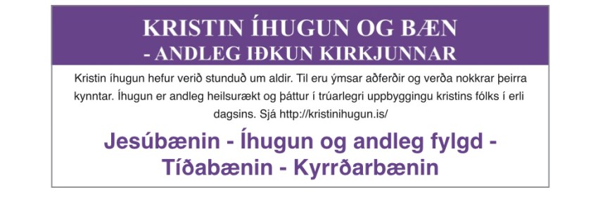 Erindin voru flutt á fræðslu- og umræðukvöldi í Glerárkirkju vorið 2014. Kristin íhugun hefur verið stunduð um aldir. Til eru ýmsar aðferðir og verða nokkrar þeirra kynntar. Íhugun er andleg heilsurækt og þáttur í trúarlegri uppbyggingu kristins fólks í erli dagsins. Dagskrá: 1. erindi (Flutt miðvikudaginn 5. febrúar 2014) Sr. Gunnlaugur Garðarson, sóknarprestur í Glerárkirkju. Hann hefur kynnt sér bænahefð og