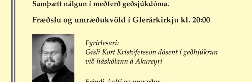 Tvö erindi verða í Glerárkirkju í nóvember undir yfirskriftinni Heilbrigði gegnum áföll og erfiðleika.  Seinna erindið 27. nóvember kl. 20 flytur dr. Gísli Kort Kristófersson dósent í geðhjúkrun við Heilbrigðisvið Háskólans á Akureyri. Erindið nefnir hann: Samþætt nálgun í meðferð geðsjúkdóma og andleg bjargráð.  Í erindi sínu mun hann benda á mismunandi leiðir til að vinna með geðræna og andlega